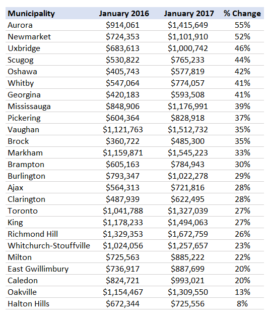 The Greater Toronto Area's real estate market is off to a very hot start in 2017. The table below shows the average price for a detached house in January 2016 vs 2017 for every municipality in the GTA.